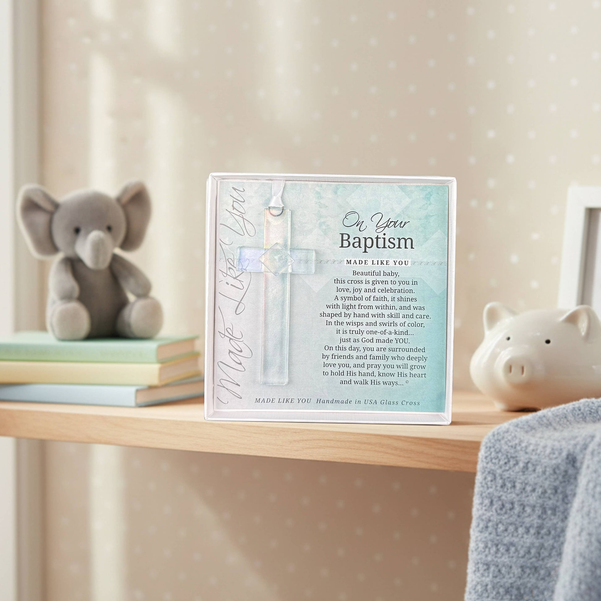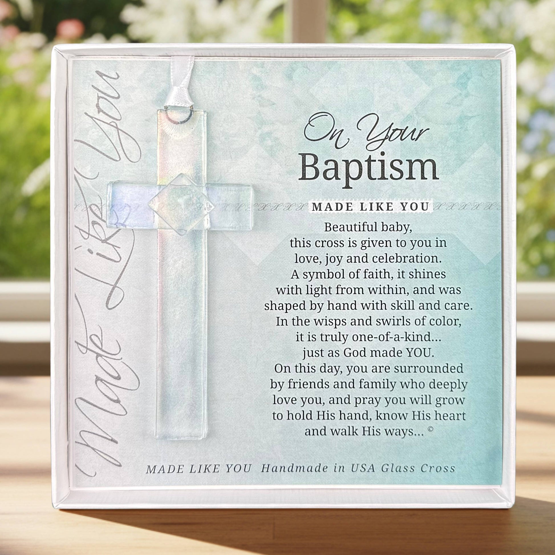 The message this gift of faith sends...You are uniquely created, loved, and appreciated will be a treasured gift now and for years to come. Gift-boxed in white 5.5x5.5 clear top box with Made Like You sentiment and art.