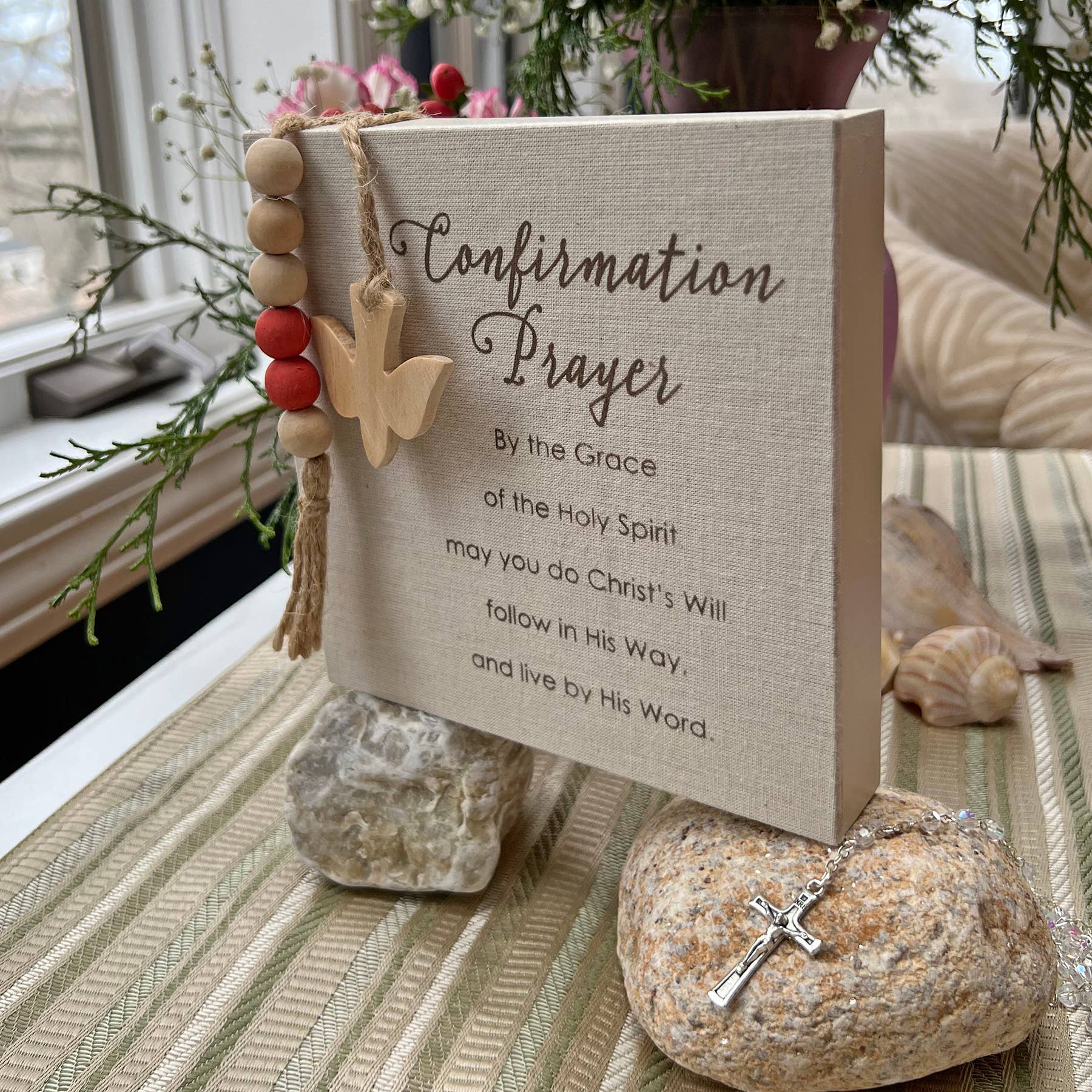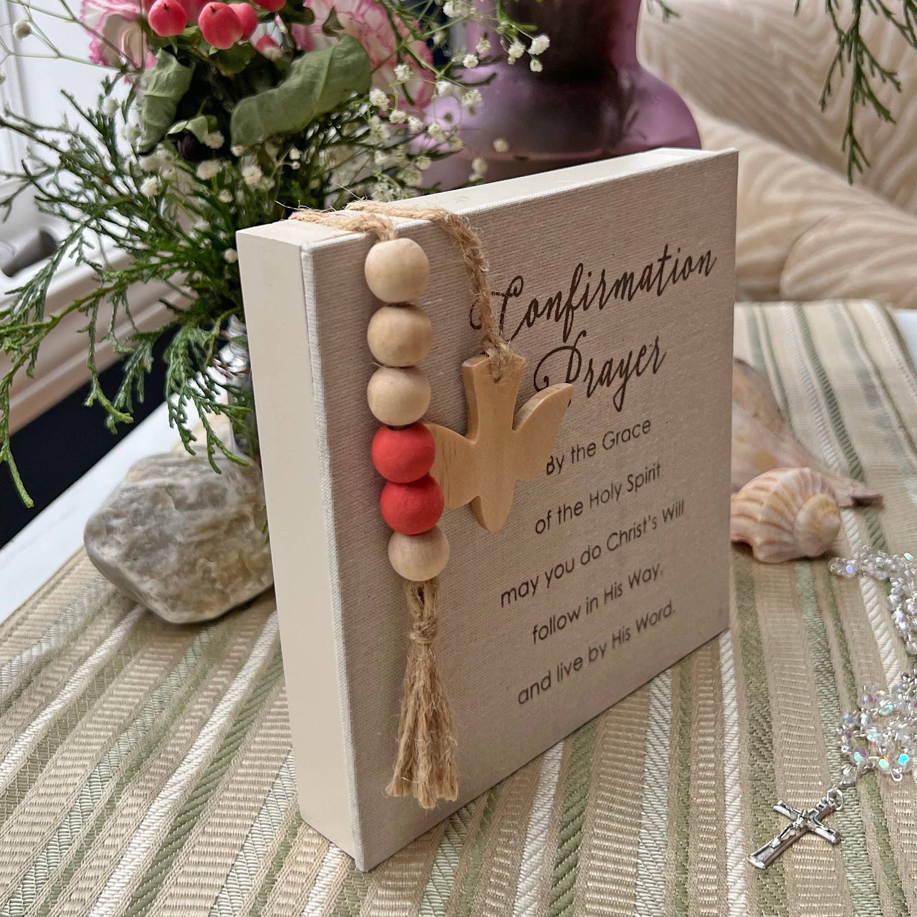 Fabric covered MDF Confirmation prayer plaque with wood and jute accents. Ready to hang or stand. 6" x 6". Boxed.