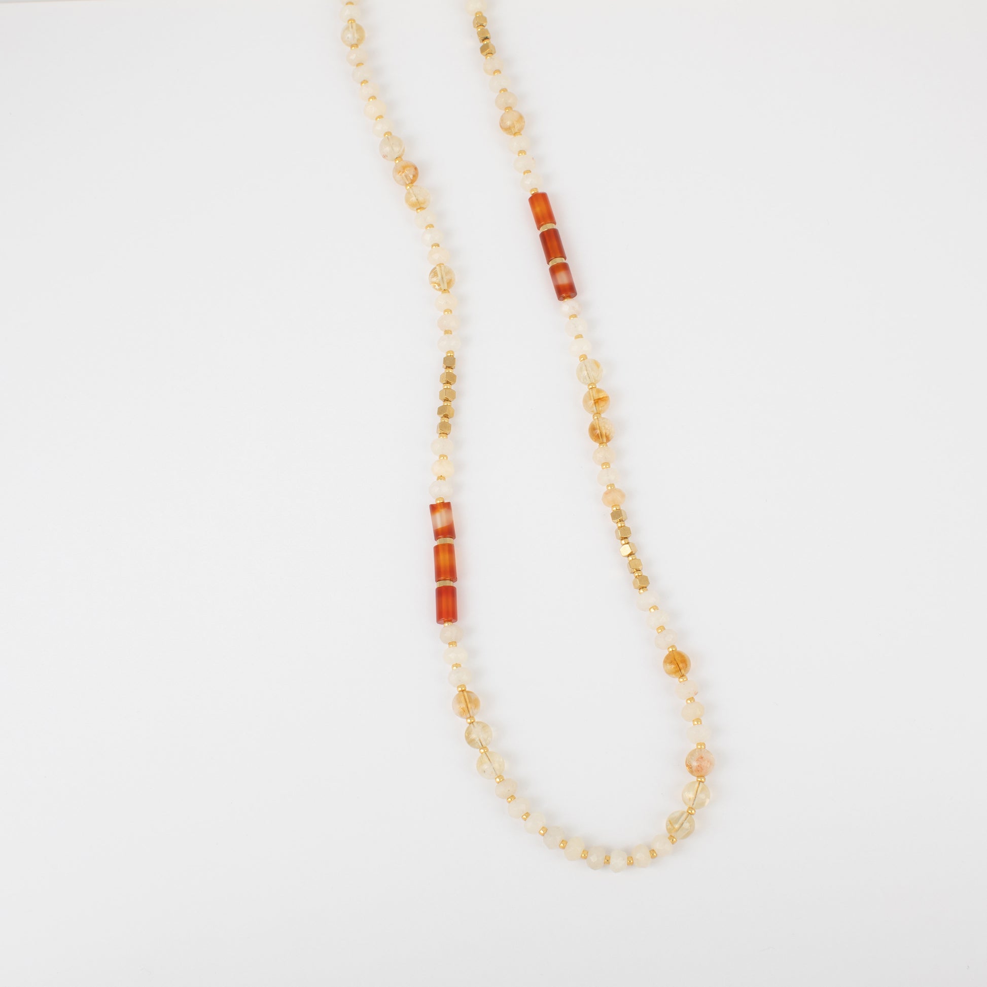 The Sundance Necklace is a warm and radiant blend of color and texture. Crafted in gold stainless, it features a stunning mix of glass, stainless, red agate, citrine, and crystal beads in rich shades of peach, white, gold, and red. Adjustable from 27"-30", this versatile piece can be worn long, double wrapped for a layered look, or styled with a charm at its center for a personalized statement. Whether worn solo or stacked, the Sundance Necklace brings effortless elegance and earthy charm to any outfit.