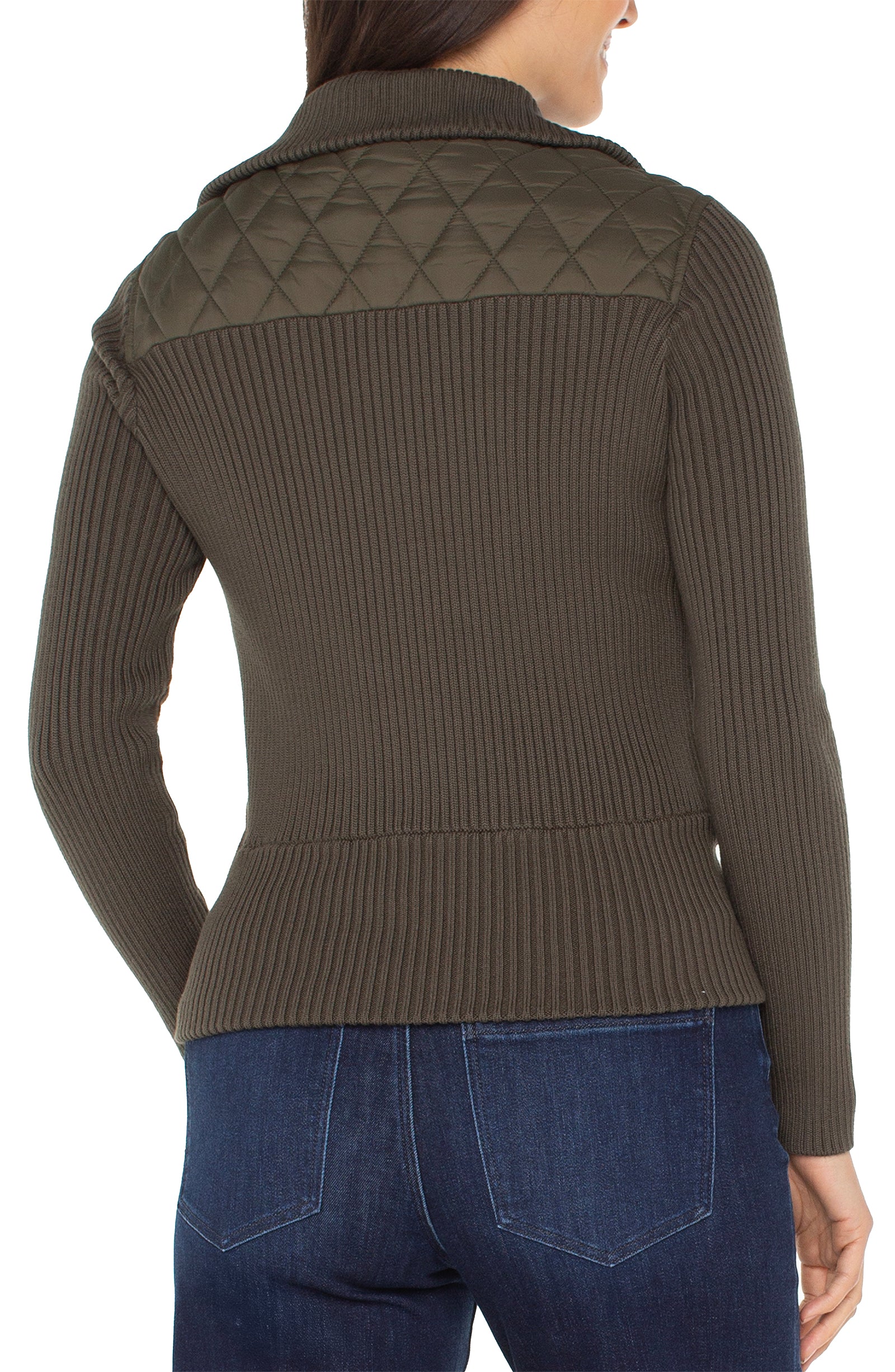 A versatile layer that blends comfort and polish. This quilted zip front sweater jacket features a soft knit collar, ribbed sleeves, and a woven quilted body for added texture and warmth. Designed with side welt pockets and a clean silhouette, it transitions effortlessly from laid-back days to refined nights.