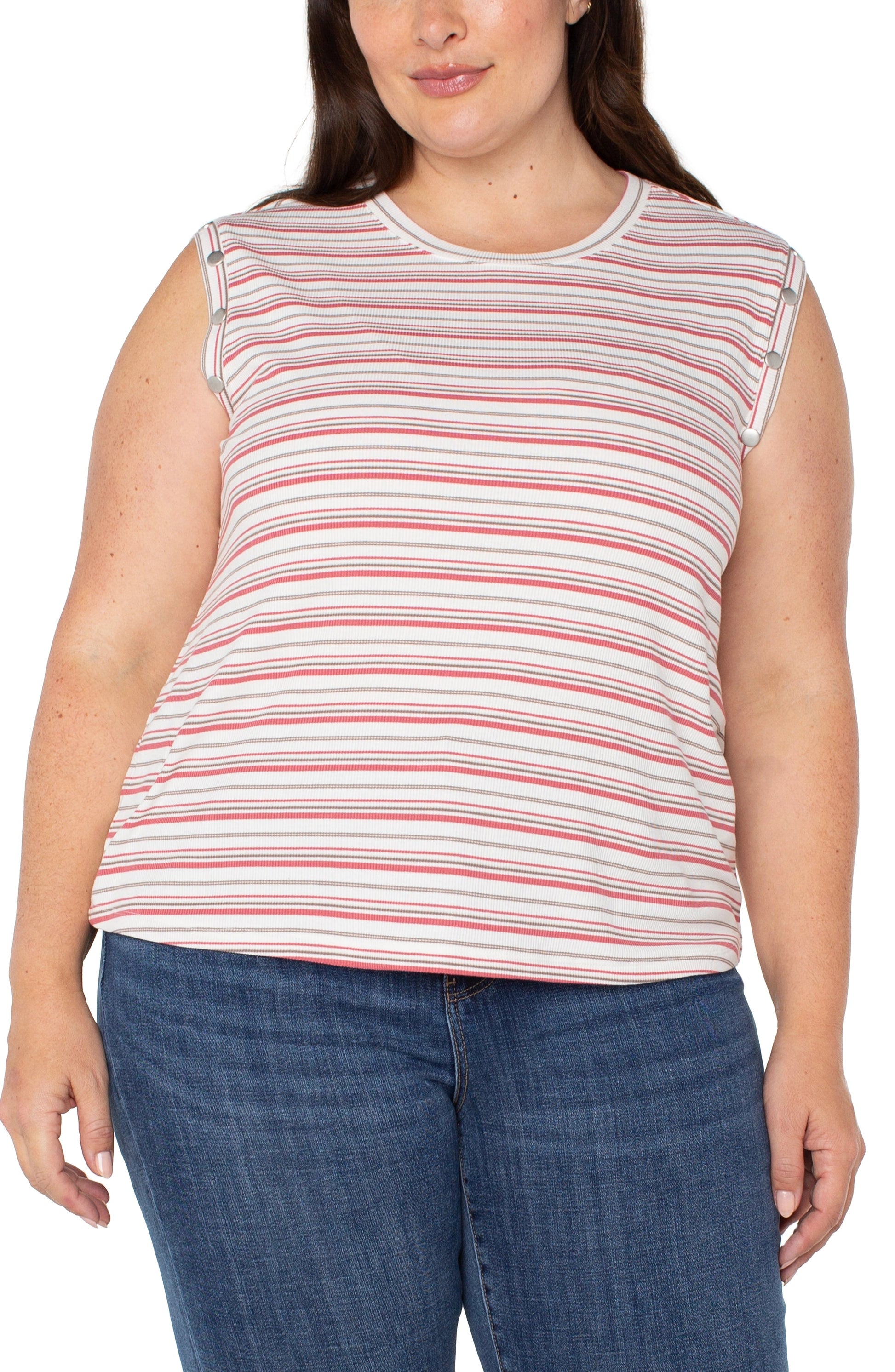 This sleeveless dolman tee is a classic with a twist! Bold stripes and decorative button detailing at the armhole give it a stylish upgrade. This crew neck top is perfect for dressing up or down. It's anything but basic!