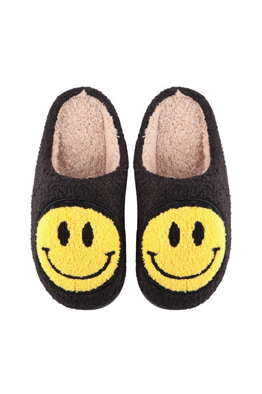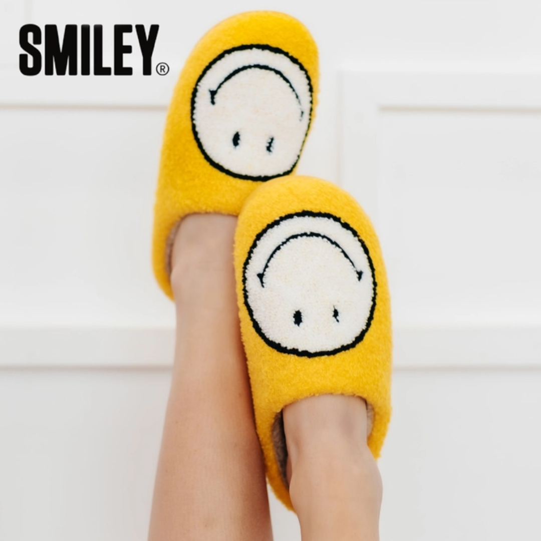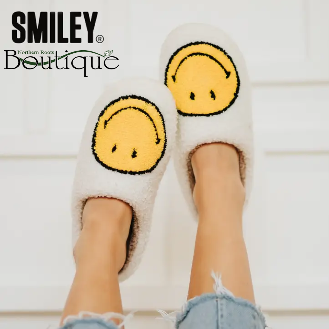Introducing the company Pretty Simple's original Smiley Slippers that are designed so you can slide into instant comfort. Featuring rubber bottoms and plush lining.
