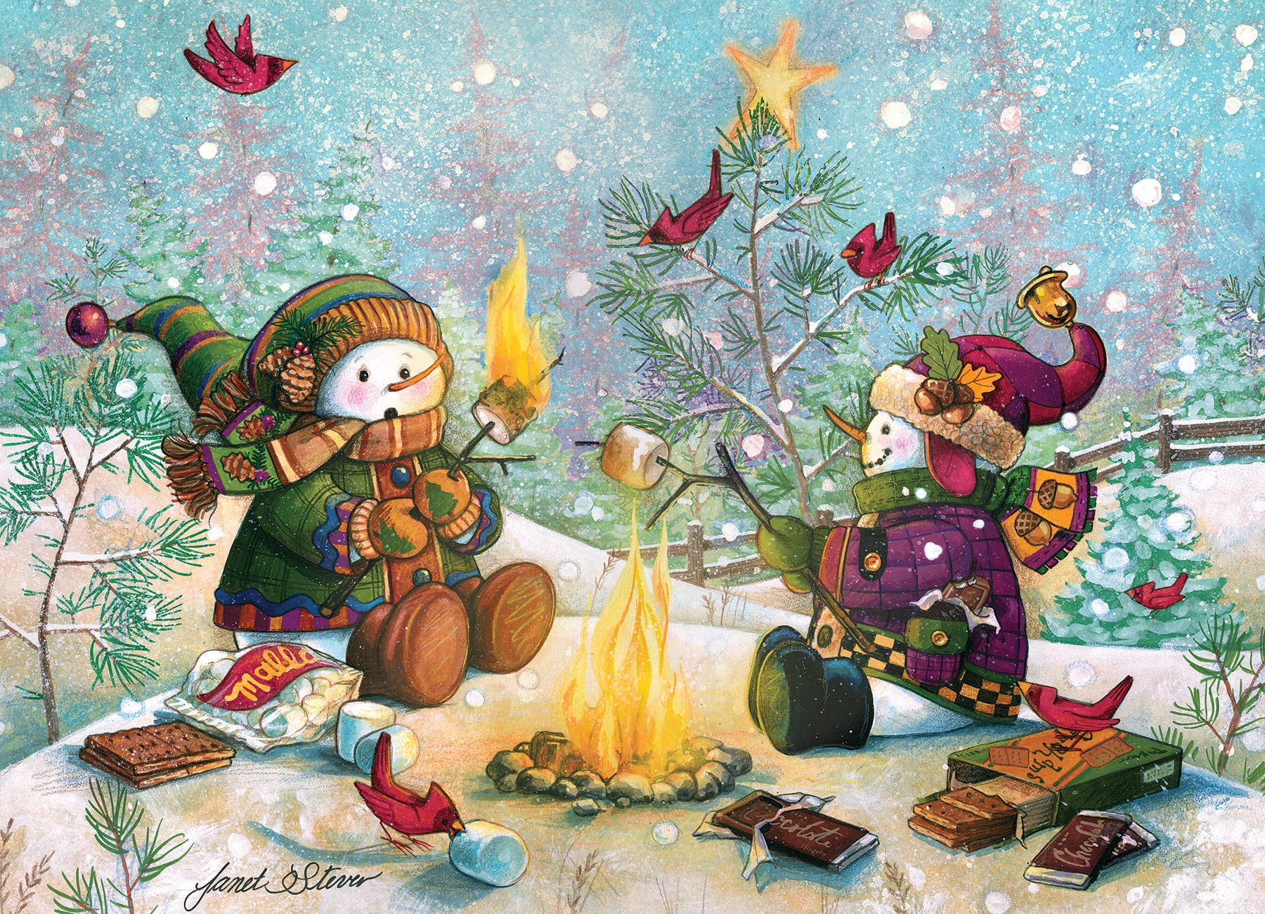 It's Smore Fun with the snowmen in winter wonderland getting toasty by the campfire as they roast marshmallows. A wholesome Family Pieces 350 puzzle with mixed size pieces from small to medium to large so everyone can contribute to the fun!
